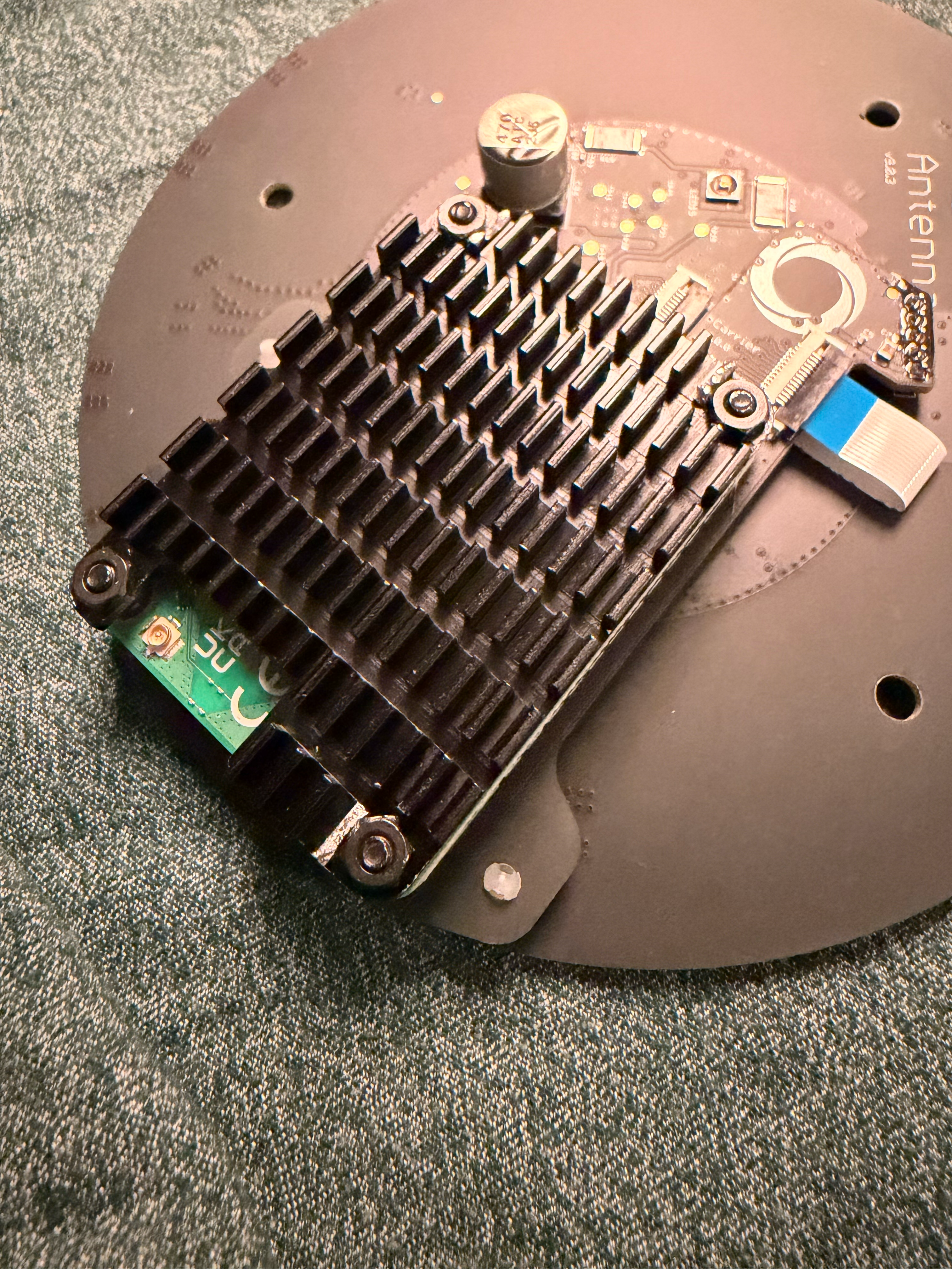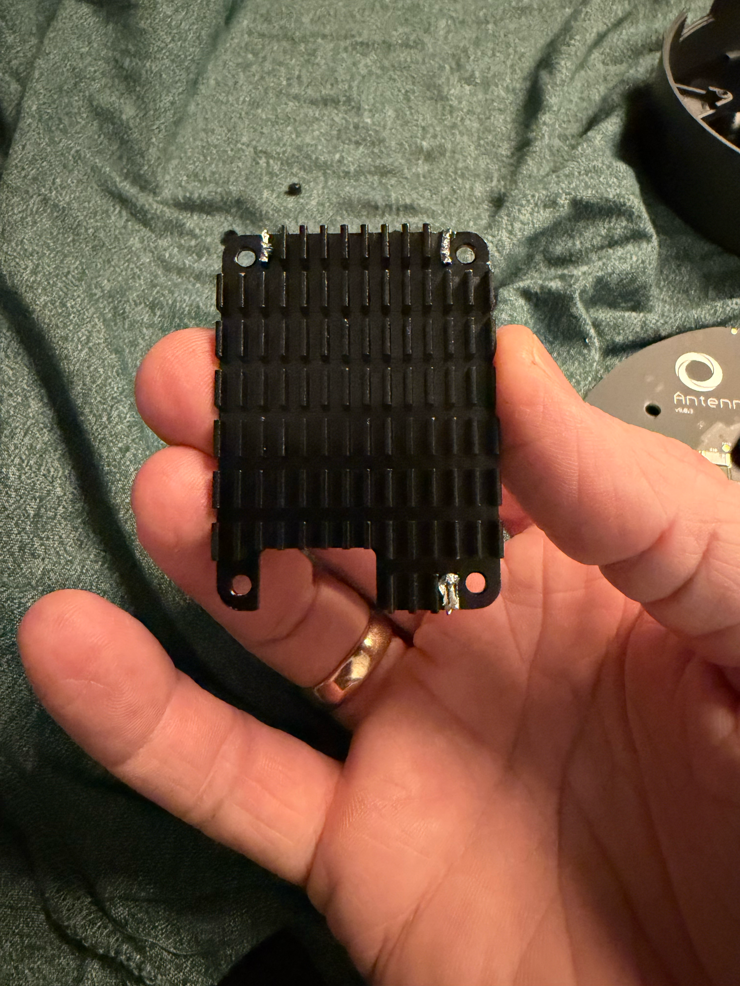 Before you rip out the heatsink, notice that there is likely thermal pads (a soft, squishy square) connecting the chip to the heatsink. This is crucial for keeping the Homey cool. If it sticks to the old module, carefully peel it off and place it back on the heatsink, so it’s ready for the new module. There are more picture later on.