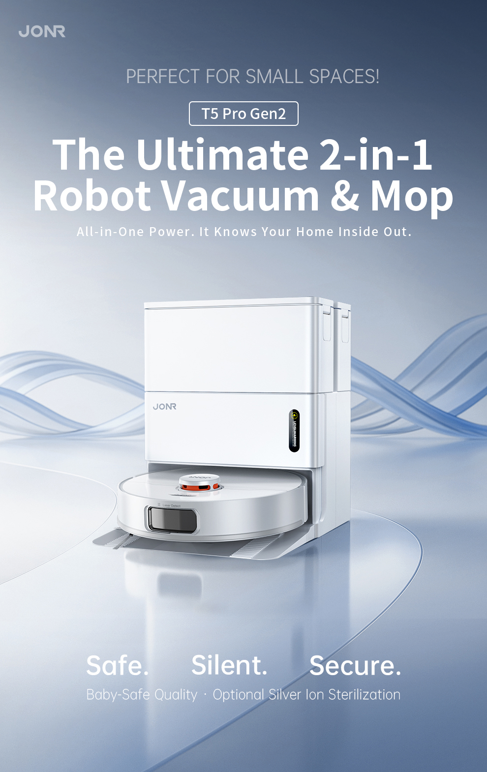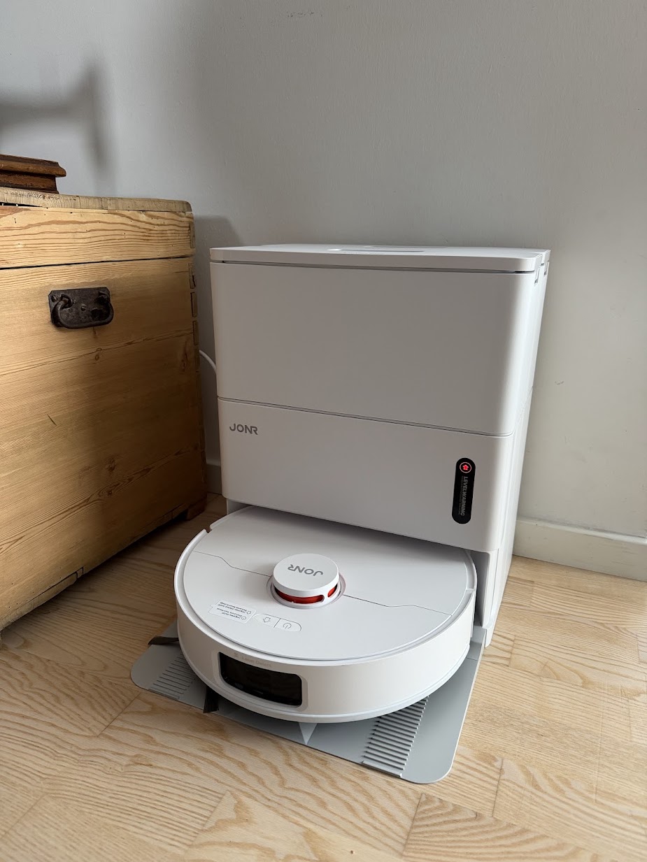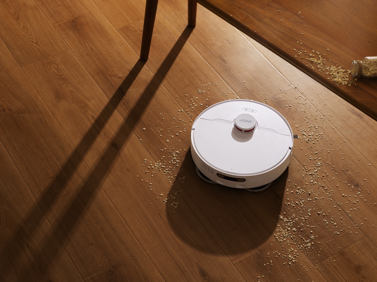 Topmodellen Jonr T5 Pro Gen 2 er virkelig god. Den ser måske lidt anonym ud, og navnet klinger ikke så “kendt” som iRobot, Dreame eller Roborock endnu. Men under overfladen får du fuld valuta, hvad angår ydelsen for en topmodel men til 50% af prisen.