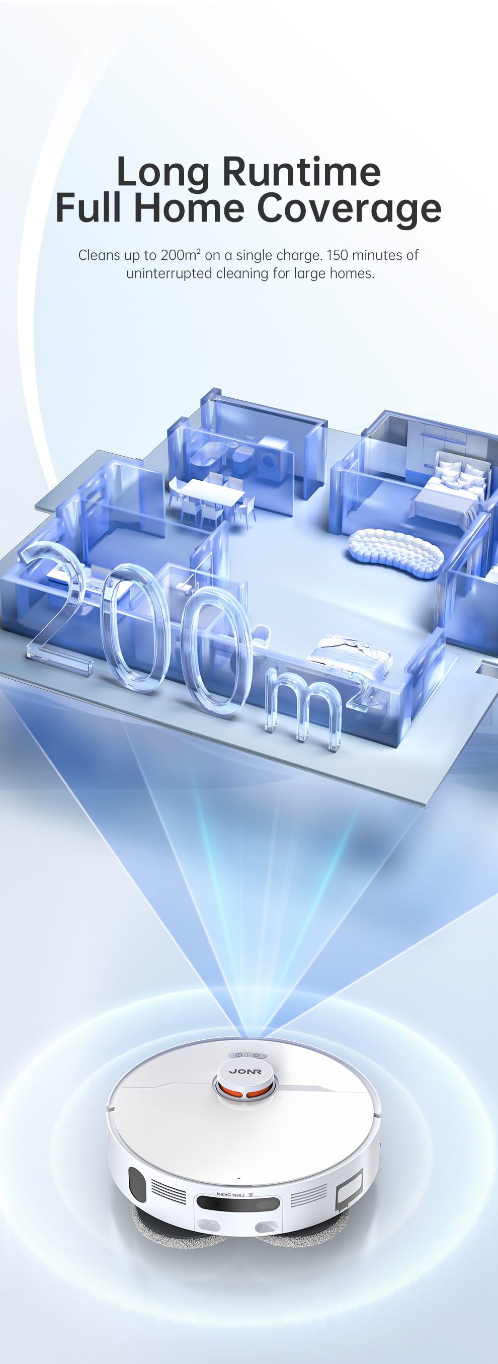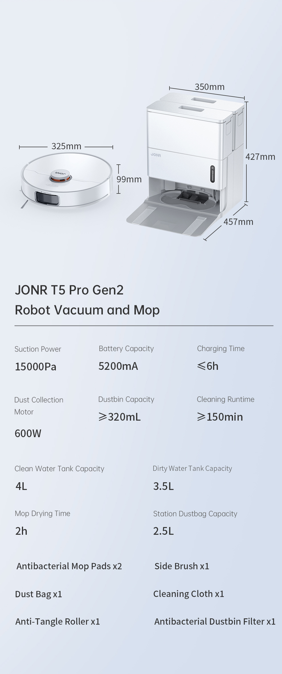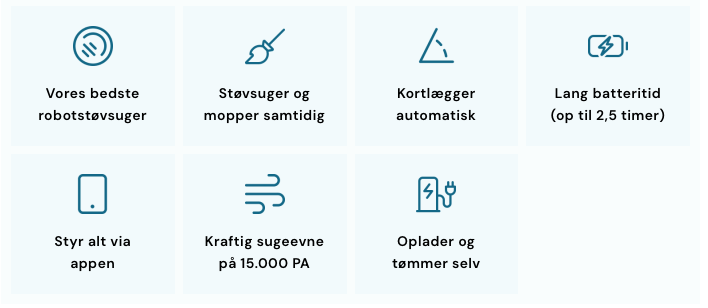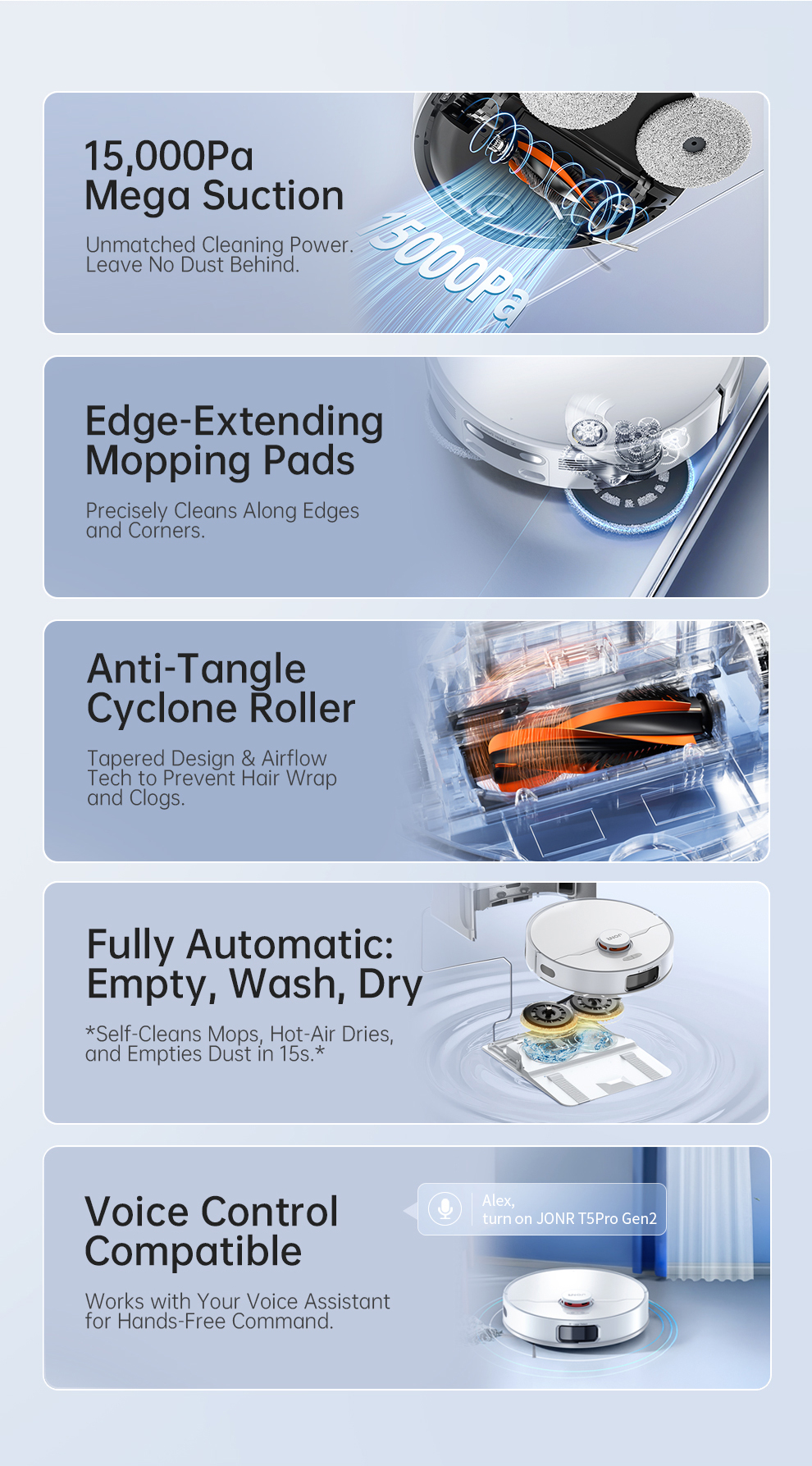 Topmodellen Jonr T5 Pro Gen 2 er virkelig god. Den ser måske lidt anonym ud, og navnet klinger ikke så “kendt” som iRobot, Dreame eller Roborock endnu. Men under overfladen får du fuld valuta, hvad angår ydelsen for en topmodel men til 50% af prisen.