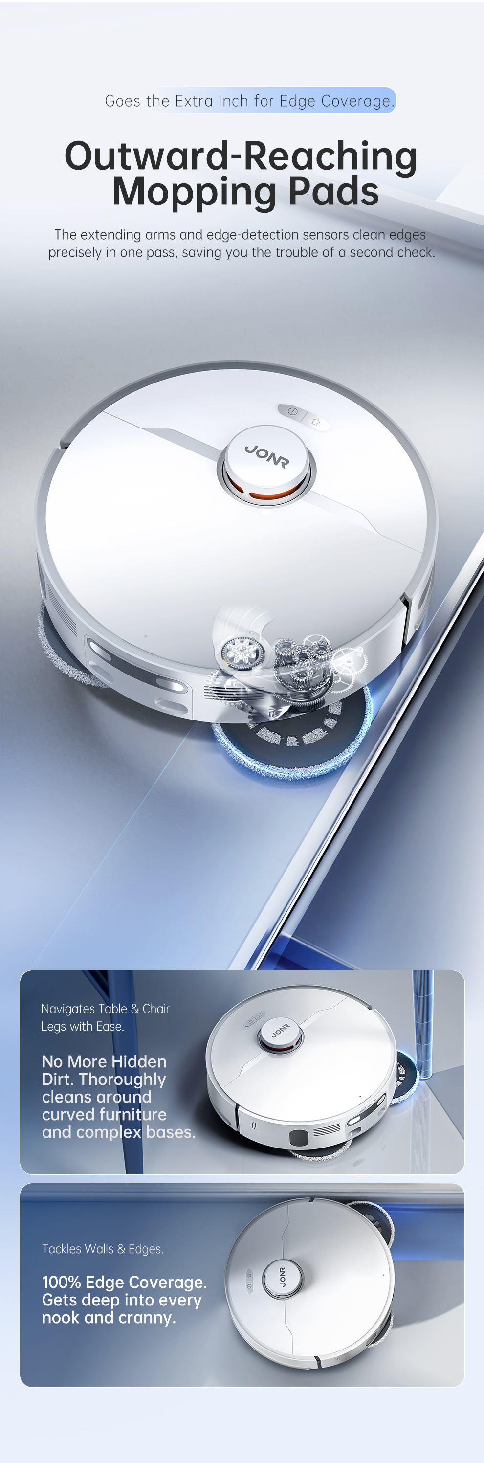 Det er her, JONR T5 Pro Gen 2-modellen skiller sig ud med sin “Flexi-Arm”. De to roterende mopper, der sidder “bagpå” vasker gulvet i stedet for bare at trække en våd klud efter sig. Det gør en kæmpe forskel på indtørrede kaffepletter eller fodspor fra en regnvejrsdag. Flexi-armen betyder, at den ene moppe kan skydes lidt ud til siden, så den kommer helt ind til panelet. Det er en funktion, vi normalt kun ser på maskiner til den dobbelte pris. Virker det? Ja, det fungerer overraskende godt. Den fanger ikke alt i hjørnerne (intet er perfekt), men den tager den irriterende stribe støv langs væggen, som gamle robotter altid missede. Det er altså når den kører rundt langs kanten i første tur at flexiarmen kommer til sin magt.