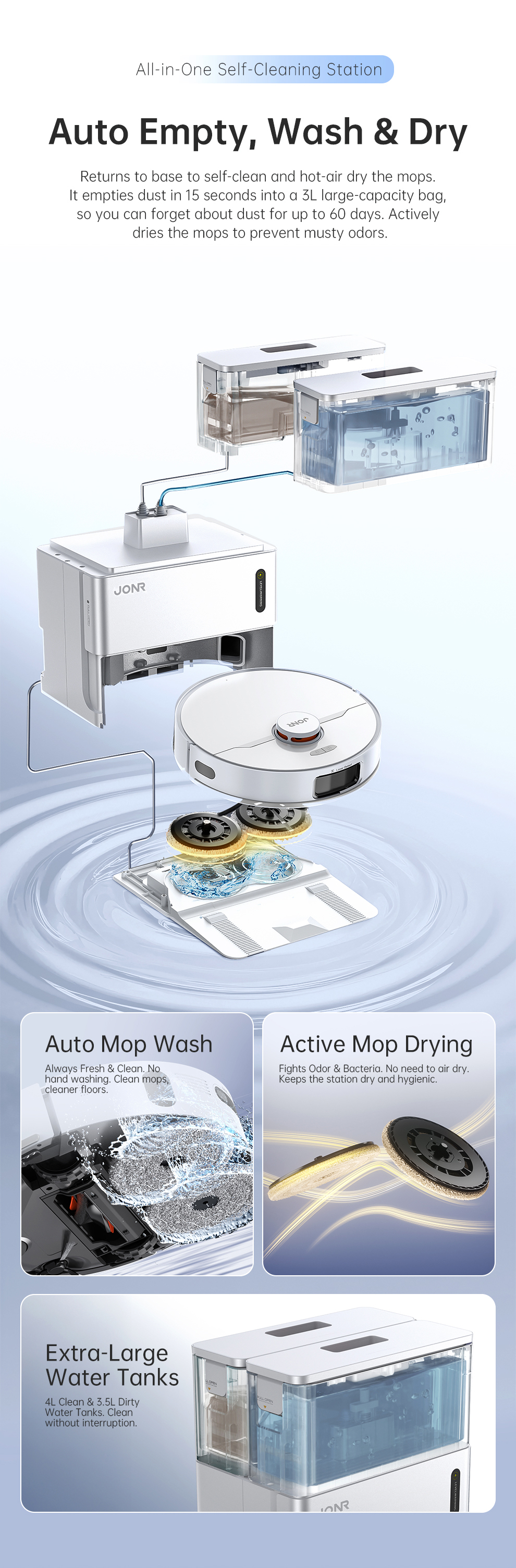 | Stationens funktioner | Automatisk tømning (støv), vask af mopper, varmluftstørring |
