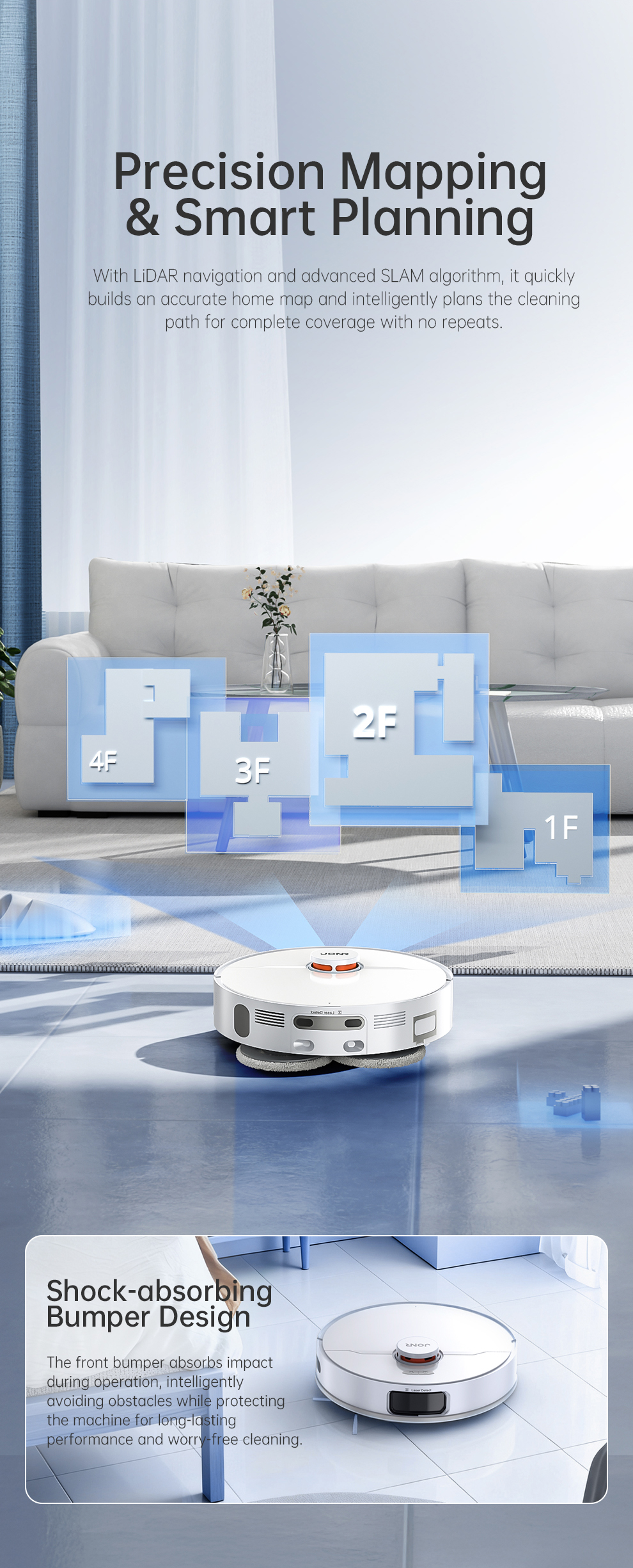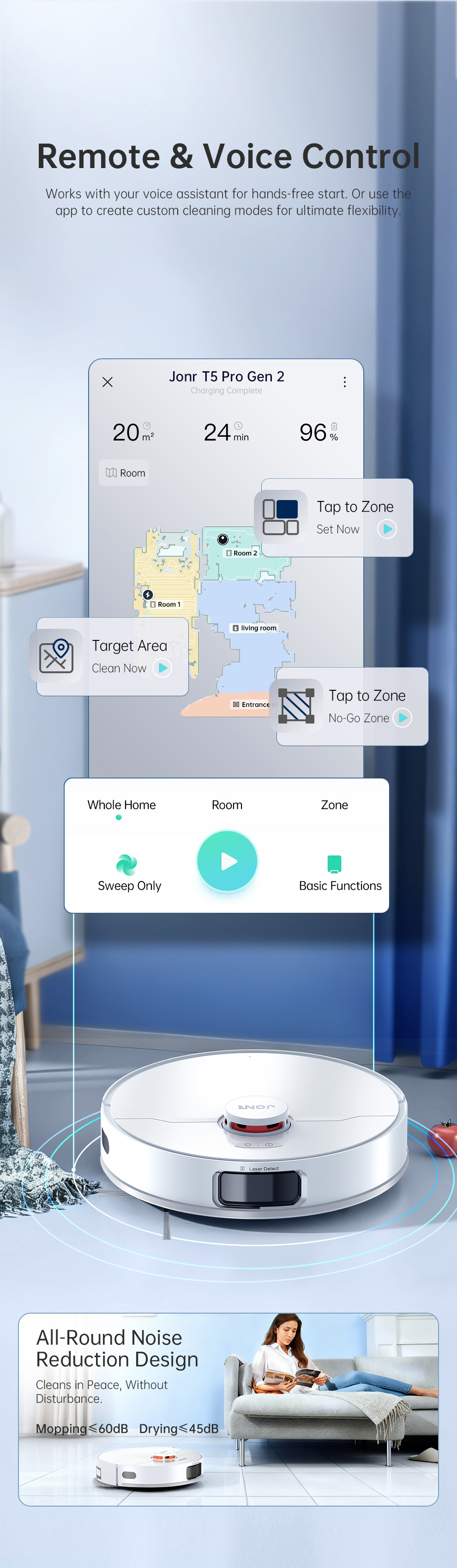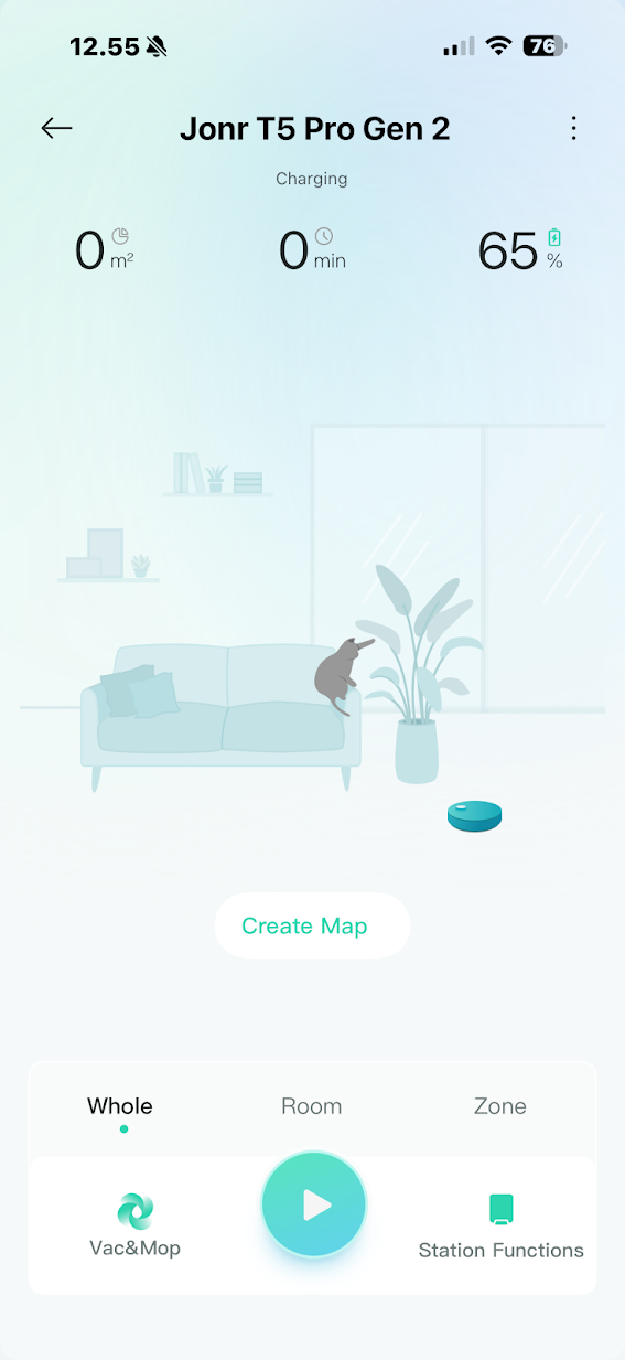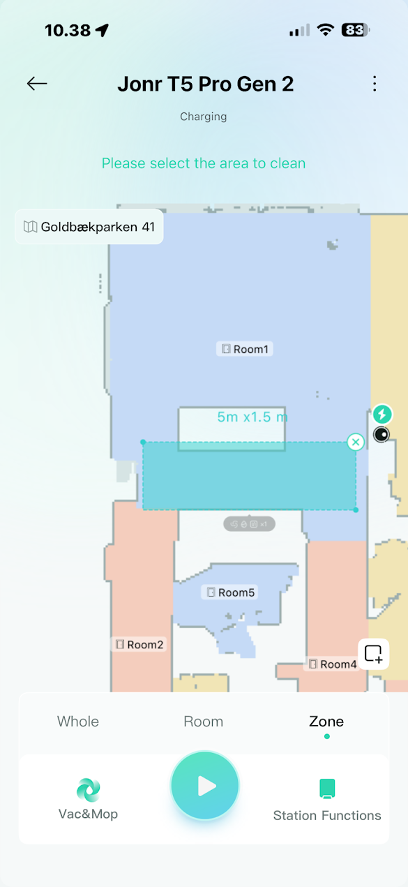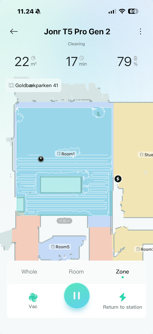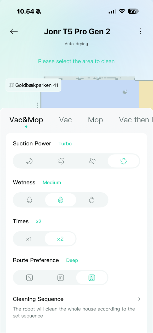 JONR T5 Pro Gen 2 bruger Xiaomi Home-appen og det er en kæmpe fordel. Appen er gennemtestet i årevis. Opsætningen tager bogstaveligt talt 5 minutter. Den finder dit Wi-Fi (husk nu, den vil kun på 2.4GHz netværk, som alle andre robotter), og så kører det. Hvis du er lidt kina forskrækket, så kan du lave et separat 2.4GHz gæstenetværk som du kan lade robotten benytte. Kortlægningen af huset er imponerende hurtig takket være LiDAR-laseren. Den tegner en præcis plantegning af din bolig, hvor du nemt kan opdele rum, lave spærrelinjer og “no-go” zoner. (tjek evt. fra min tidligere anmeldelse af Xiaomi s50).