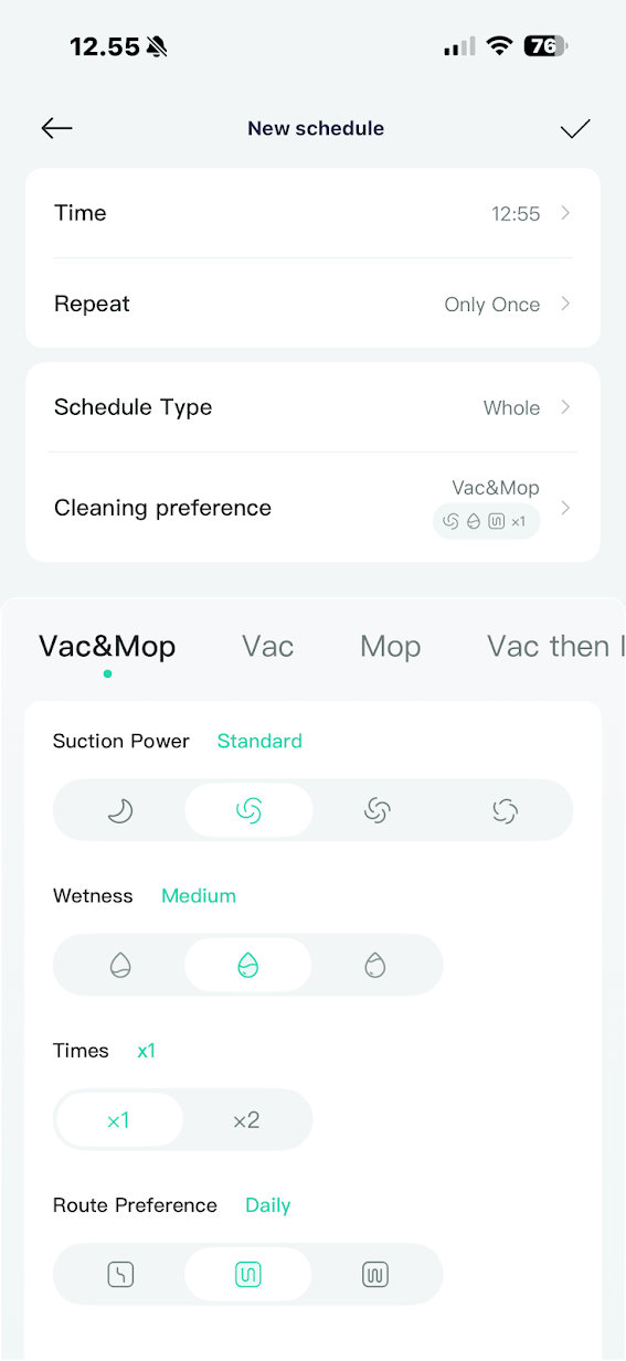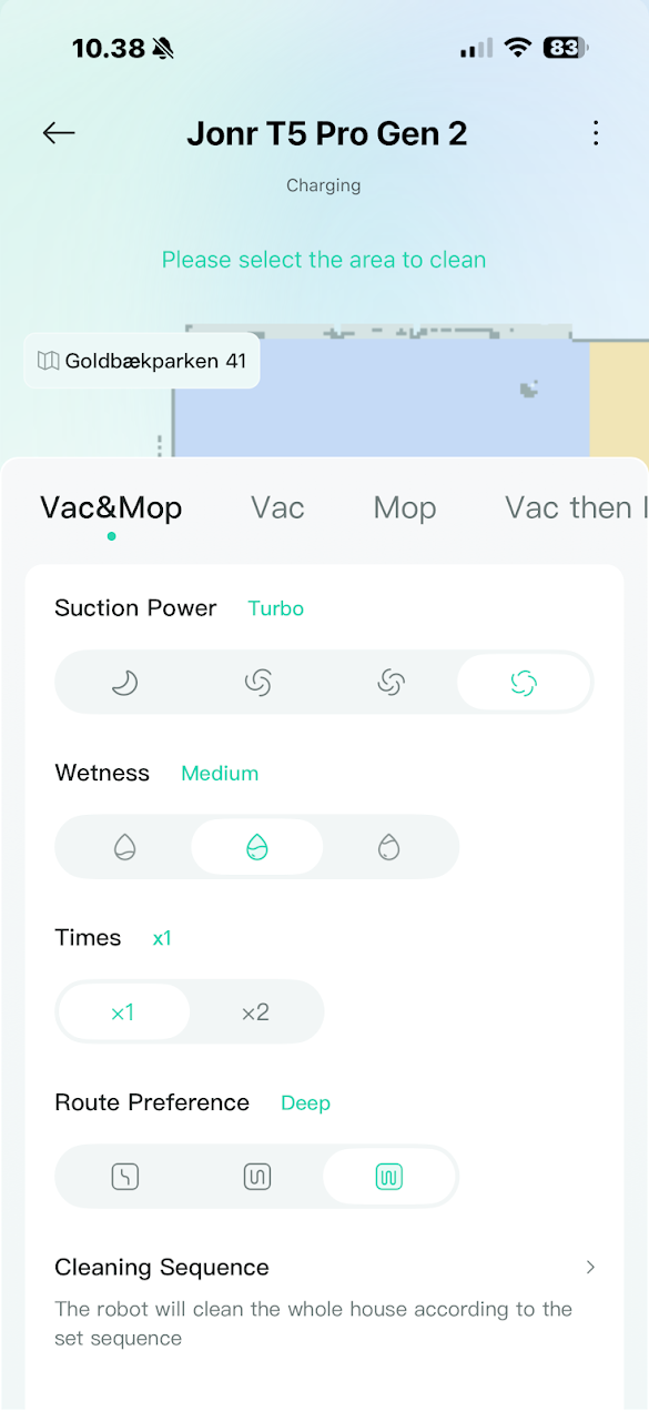 Når du planlægger et rengøringsopgave, så kan du vælge om den skal støvsuge først, og så vaske gulvet bagefter, eller du kan vælge, at den støvsuger og vasker i samme omgang. Du kan selvfølgelig også blot vælge én af delene. Jeg kører med at den både støvsuger og vasker samtidig, så den ikke skal køre hele huset igennem 2 gange. Jeg ved ikke om det ville være smartere at gøre det en-ting-af-gangen, men det fungerer, så hvorfor ændre det.
