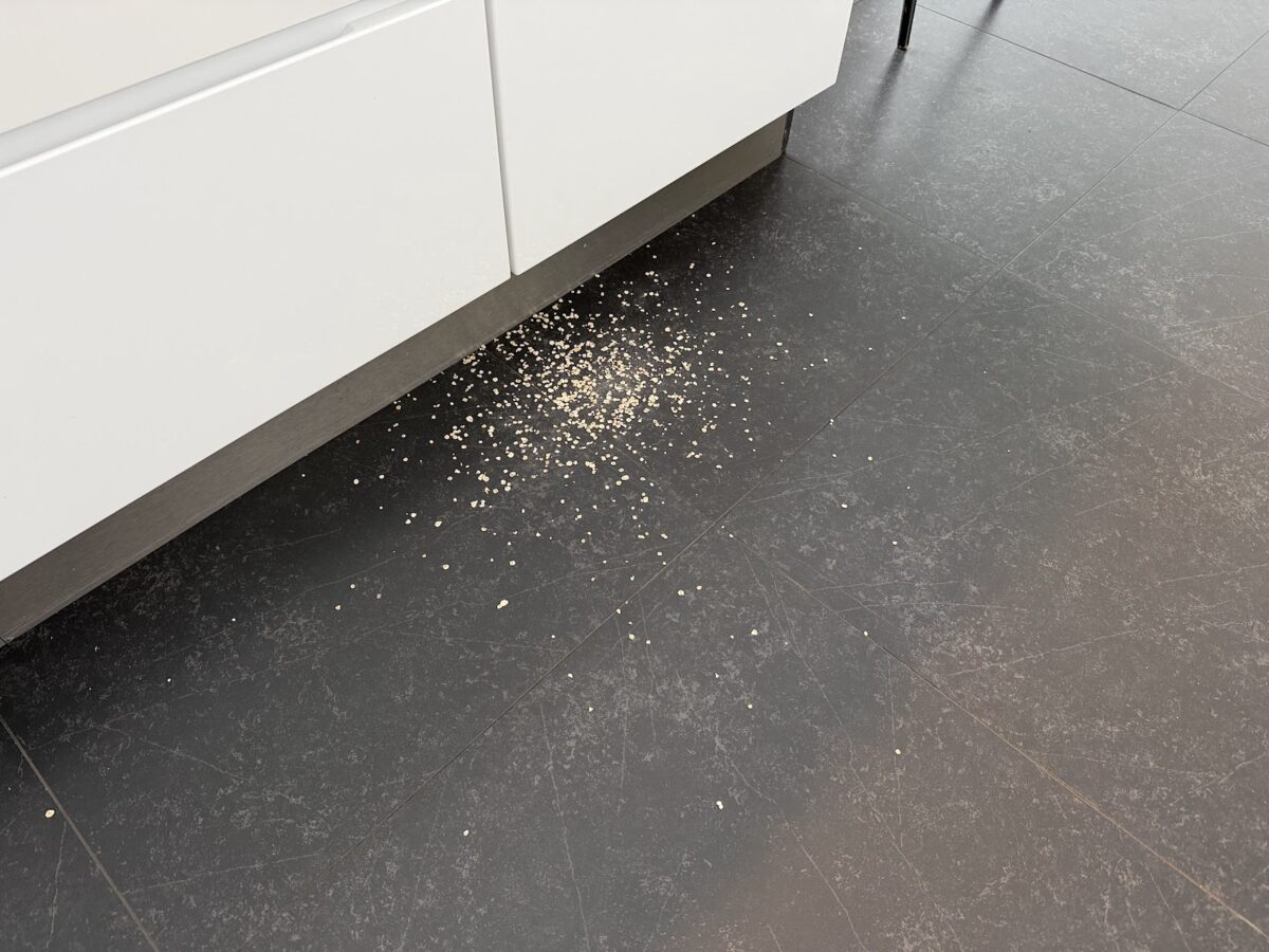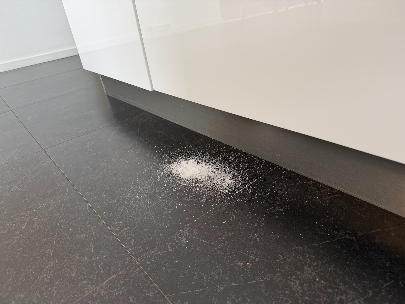 Jeg har bevidst lavet en lidt “umulig opgave” for at presse robotten og se hvor god den rent faktisk er. Hvis man ser reklamefilmen fra JONR (hop til video), så ligner det at den lige klarer oprydningen efter en stor fest. Det er en sandhed med modifikationer. Jeg satte det op, så jeg tog en stor håndfuld havregryn og lagde langs kanten af vores køkken-ø, og på den modsatte side en håndful med alm. sukker.