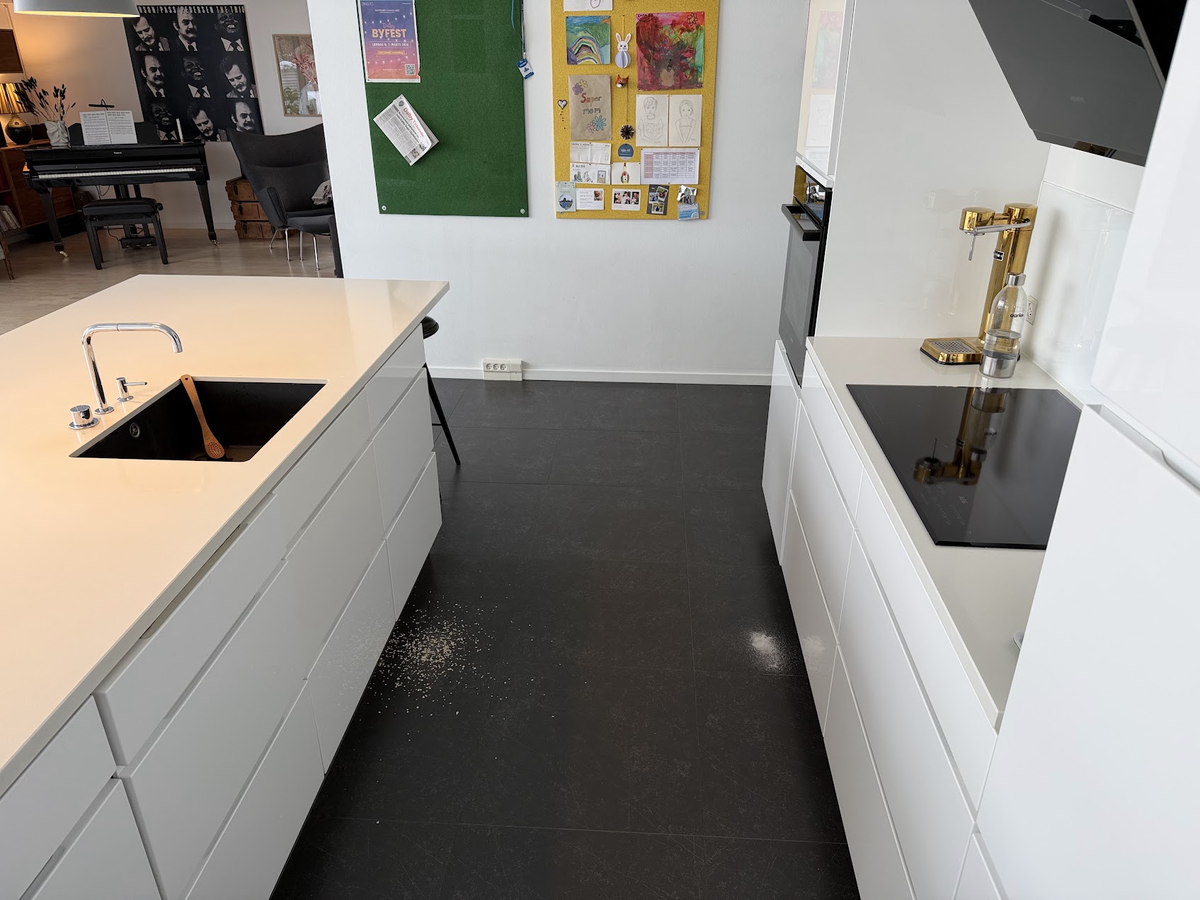 Lige nu er det vinter med salt etc uden for døren. Der har jeg ladet den køre ekstra meget i vores entré for at få salt aflejringerne vasket af hver dag. Det er faktisk ret smart. Jeg har bedt den om først at støvsuge, og bagefter vaske 2x. Her vil jeg anbefale at den bruger den “mest våde” indstillinger, og også skyller mopperne hver 5 minuter, da man ellers vil kunne se saltet bagefter.
